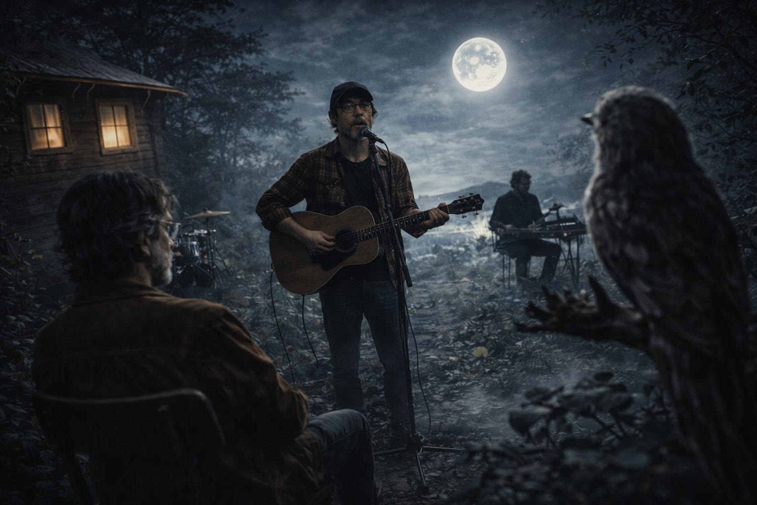 Cadeira vazia, cenário cheio. Um salto mortal do centro de São Paulo para a Mata Atlântica costeira, pensei. Sem escala, carro, ônibus ou o que fosse… só imaginação a alimentar A Criatura! Mark Linkous, o cowboy da música alternativa do sul dos EUA, e meu querido Urutau. Um sarau dark, em plena floresta, ao lado de casa, perto do mar…
